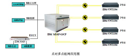 IDM VNT2204可以與我公司的集中型多業務傳輸設備IDM MSAP-CP 設備VNE 盤互通,組建點對多點星形網絡,多路遠端視頻和語音在控制中心集中接入。控制中心可集中在大屏上顯示多畫面視頻,控制中心調度臺可通過鍵盤或搖桿實現對對端云臺的控制,支持視頻和語音綁定功能。IDM MSAP-CP 通過E1接口接入PCM 設備或直接出64K 業務,實現遠端語音部分的接入。