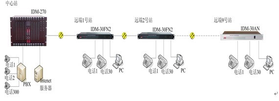 IDM-30FN2提供2組光接口,適用與點對點及鏈網拓撲網絡結構。在一根光纖線路資源下,可為8個用戶節點提供語音數據。每個節點可配置30路64K業務,采用總線型或點對點形式配置,整條光纖鏈路上的所有節點共享線速100M以太網接口。