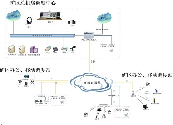 針對實際情況,在調度控制指揮中心選用基于軟交換技術開發的多媒體融合調度平臺作為礦區辦公和調度的交換平臺;配置多媒體軟件調度臺作為調度控制指揮中心的操作平臺;在礦區內各個崗位配置座機或無線手持終端作為工作人員的辦公和調度終端。要求綜合調度平臺可以實現對礦區內的所有人員語音終端的注冊、規劃和統一管理調度,對礦區內所有視頻監控設備的集中規劃和統一調度,音視頻的聯動調度等多媒體業務。