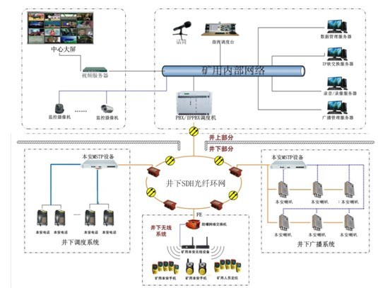 上圖為煤礦企業調度系統整體組網拓撲圖,包括:行政、調度、無線、視頻聯動和廣播聯動多合一的組網圖;系統中煤礦及井口之間均可采用光口匯接,組合成一個整體的井上、井下,有線用戶、無線用戶,視頻監控點,井上井下語音廣播系統的通信網絡,最大限度的利用現有資源,使其功能最大化使用。